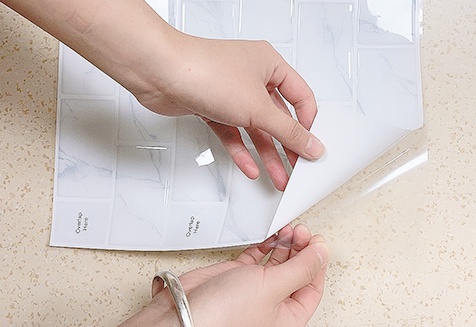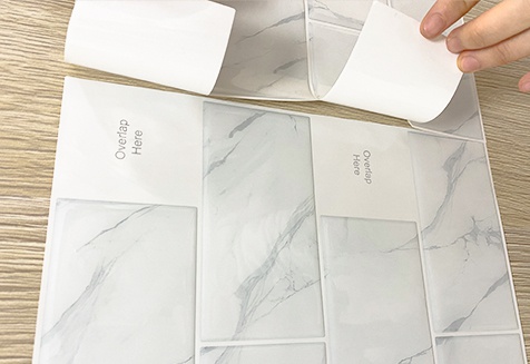 Place the exposed adhesive step by step on the wall . As you peel, continue applying pressure to the tile,until the backing is completely removes.